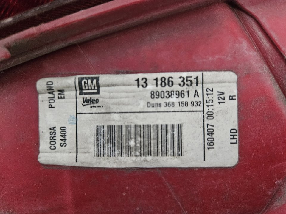 Artículo: PILOTO TRASERO DERECHO Marca: OPEL Modelo: CORSA D Fecha actualización: 30/09/2025 16:52 Referencia Visual: 93189091